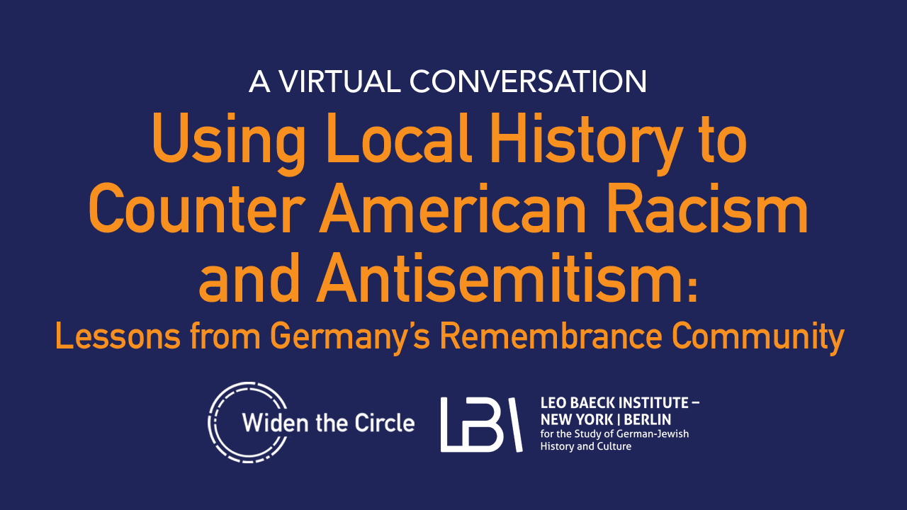 American civil rights educators and activists have been engaged in deep dialogue with counterparts in Germany who focus on local German Jewish history and the Holocaust, thanks to Widen the Circle’s Visiting Program. As America struggles to acknowledge and counter its own legacy of racism and bigotry, two of the program's participants will discuss how certain German approaches to educating about Jewish history and the Holocaust can be applied to this country. Presented online in conjunction with the Leo Baeck Institute: November 17 at 6:30 p.m. EST.